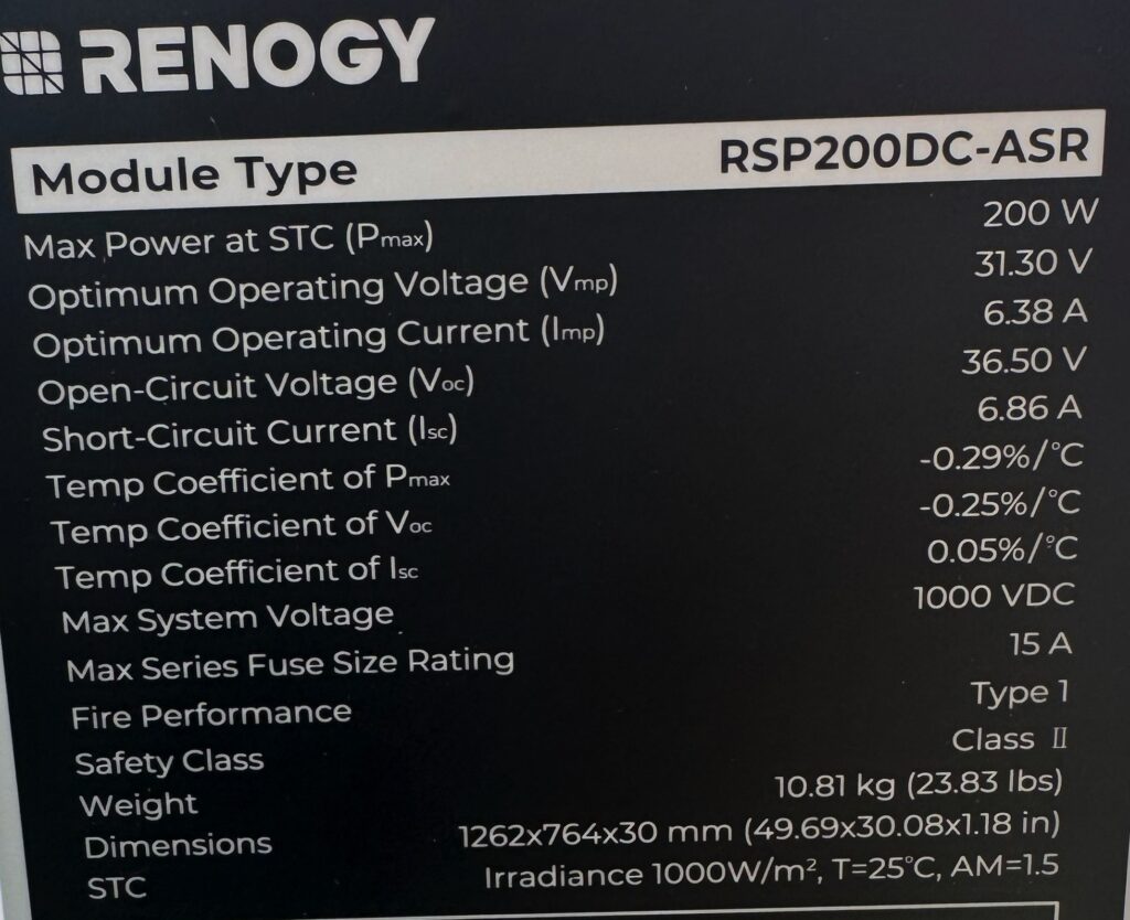 Our panels are Renogy Shadowflux 200 panels. These are designed to maintain maximum output in partially shaded environments. Solar panels use bypass diode to shut off part of a panel when it is shaded. Shaded cells on a solar panel CONSUME power as the electricity is always trying to reach equilibrium. To prevent this newer panels will shut off shaded areas. Most panels reduce build complexity and cost by only have a few bypass diodes. They tend to split the panel into 3 columns. If part of a column is shaded it cuts power to/from that column. You quickly go from 100% output on a panel to 66% then 33% then nothing. The Shadowflux design uses 28 bypass diodes, so the panel is divided into squares. Shade on the bottom right corner only turns off those cells, meaning you still get 85% or better output. This can have a notable impact on real world installations at a typical suburban home where shadows are often an issue.