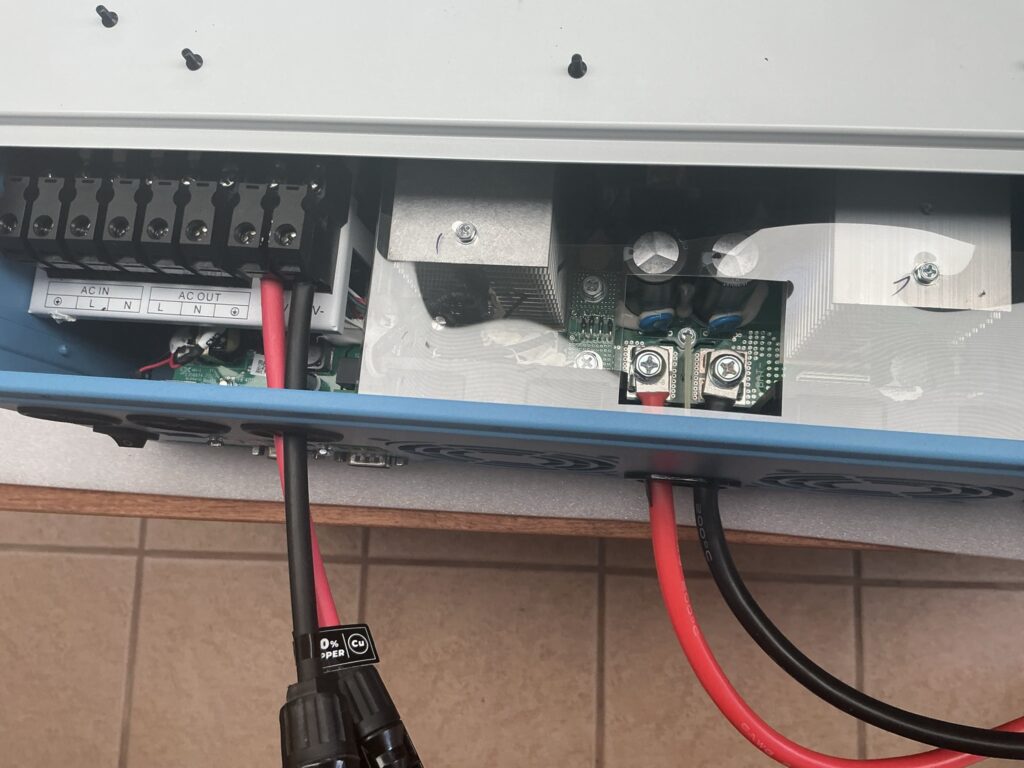 Next was installing the solar input MC4 connectors. MC4 is an industry standard connector that makes it much safer to connect and disconnect high voltage DC like a solar string. The cables we used were from a prior project and already close to the right length. I trimmed and re-stripped the ends for a clean connection in the U-clamp screw down posts that are in the chargeverter. The chargeverter is designed to accept stripped bare wire other than for the battery connection. The parts list includes cable for this, the 6′ 10AWG solar extension cable. It will be far too long for this use case, so you’ll want to cut it to the about a foot in length and strip the end to install this into the chargeverter. Remember, red should be positive and black for negative in a typical DC solar setup.