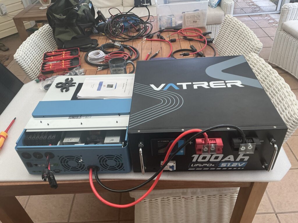 To build this setup you’ll need the battery, inverter, a 110V power patch cord to plugin the Inverter, a short 2 foot length of 3-wire 110V cable, and an AC outlet box. We chose the Vatrer 48V 100Ah battery, the Solark 5000W chargeverter, and some basic cables and outlet boxes as suggested in Will’s original article.