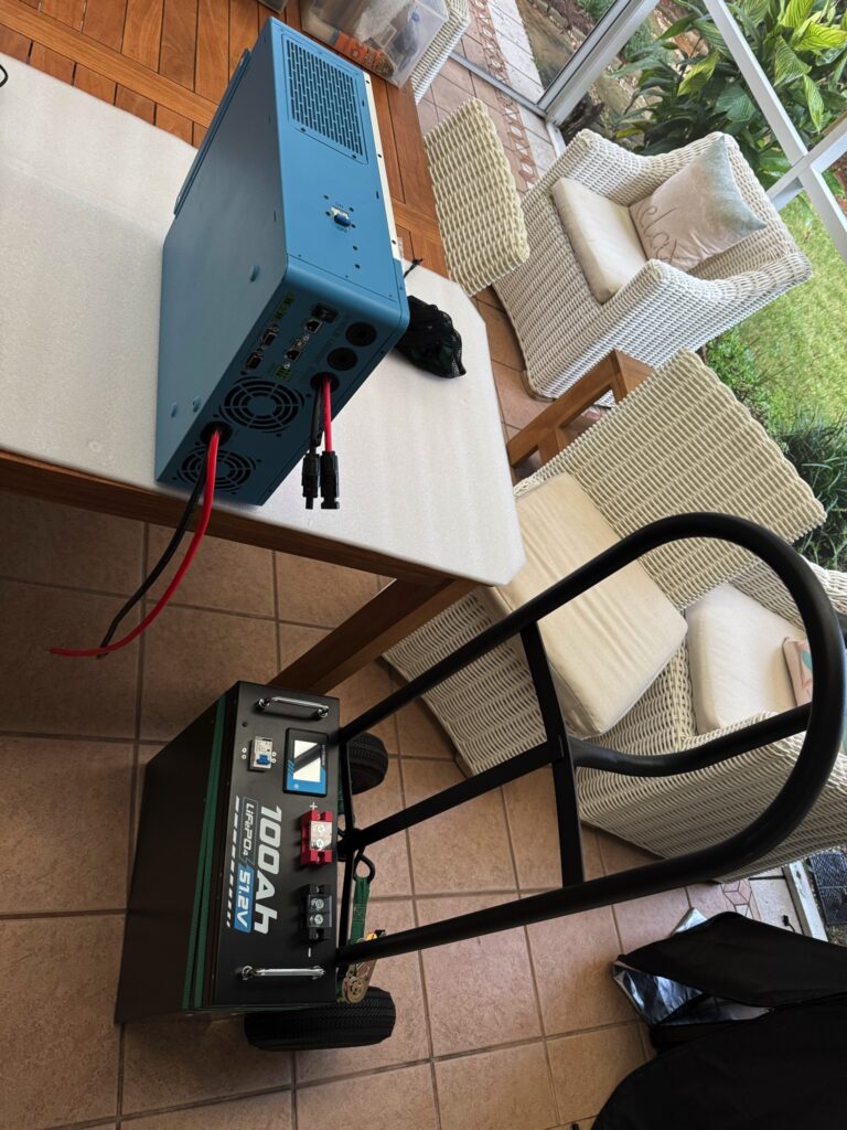 We are now ready to connect our solar. I setup 4 panels originally (later 6 panels) by just leaning them against some yard benches and tables. They need to be wired in series to boost the voltage. The chargeverter needs at least 120 volts to get the MPPT (solar charger controller) online. The Renogy panels are 31.3 volts Vmp , so 4 of them in full sun will do the trick. To wire panels in series connect the negative wire from one panel to the positive on the one next to it. The first panel in the line up will have a positive line with nothing attached. The last panel will have a loose negative cable. Once connected they can stay connected (until you need to move them, like I did). To make the cables reach the hand truck, connect the back solar extension cable to the negative on the last panel and the red cable to the positive.