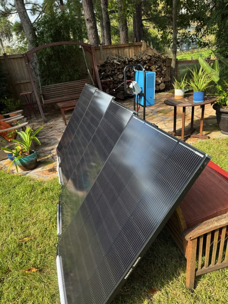 The complete build provides a mostly portable solar generator. It is fairly heavy, around 150 pounds, but easily moved around with the hand truck – less the solar panels of course. The panels are light and not too large, they can be easily moved around by most people. Note that there is not stand for the panels. I’ve propped them up against deck chairs and found a notched 2×4 at 4 foot length can serve as a temporary stand.