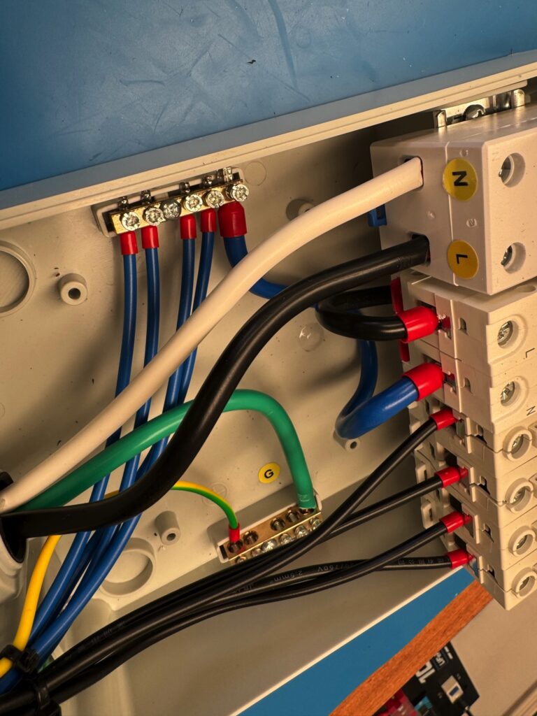 Next up – lie the hand truck down again and insert the cable from the AC outlet box into the chargeverter. Connect that to AC Output, black is live (L), white is neutral (N), and green is ground. Tighten everything using the insulated screwdriver. Check all other connections. Replace the faceplate on the chargeverter. Stand it up. We are ready for solar.