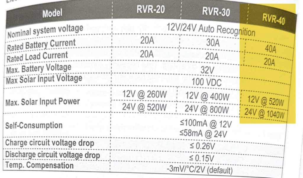 - Nominal System Voltage (12/24v on the RVR40) is the BATTERY voltage rating, this one supports 12 volt or 24 volt batteries (DO NOT mix-and-match).