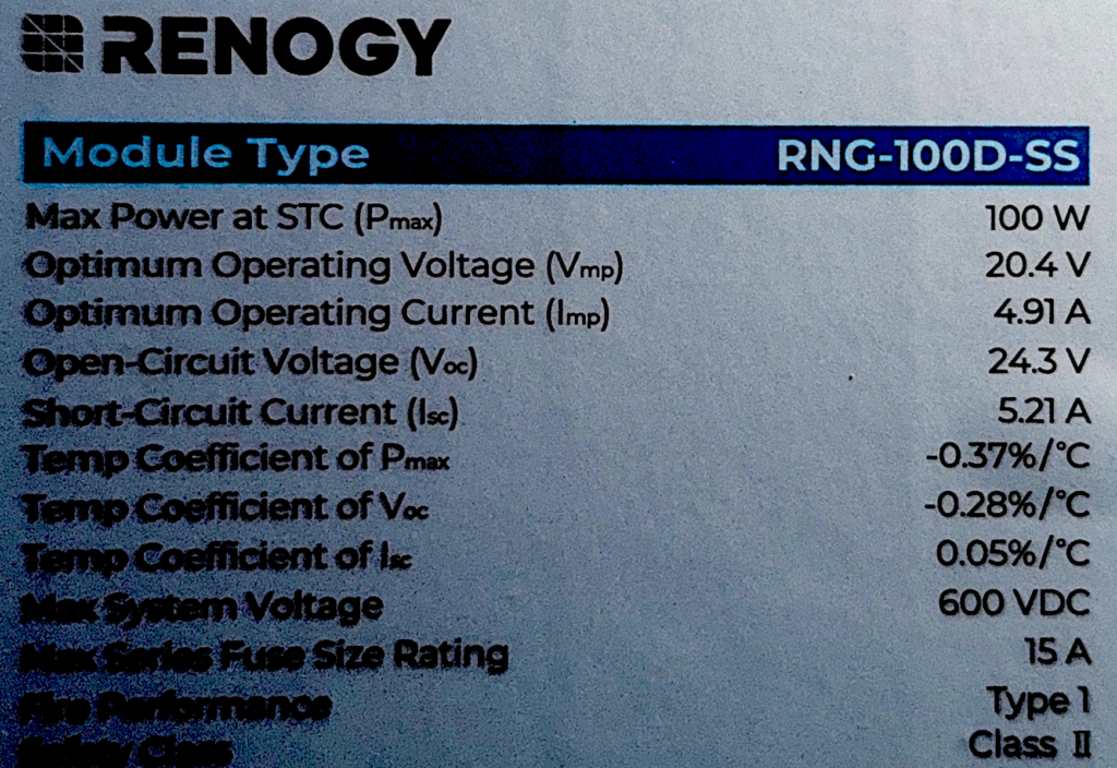 This is based on the OPTIMAL VOLTAGE of the solar panel. As you can see below, our panels put out 20.4 volts optimal power. That means on a perfectly sunny day with the panel at just the right angle it can push out 20.4 volts at 4.91 amps. Typically it is going to do far less, around 10 volts on average. However if we don’t want to turn our charge controller into flaming heap of plastic then we need to plan for the best (worst?) case scenario of 20.4 volts per panel.