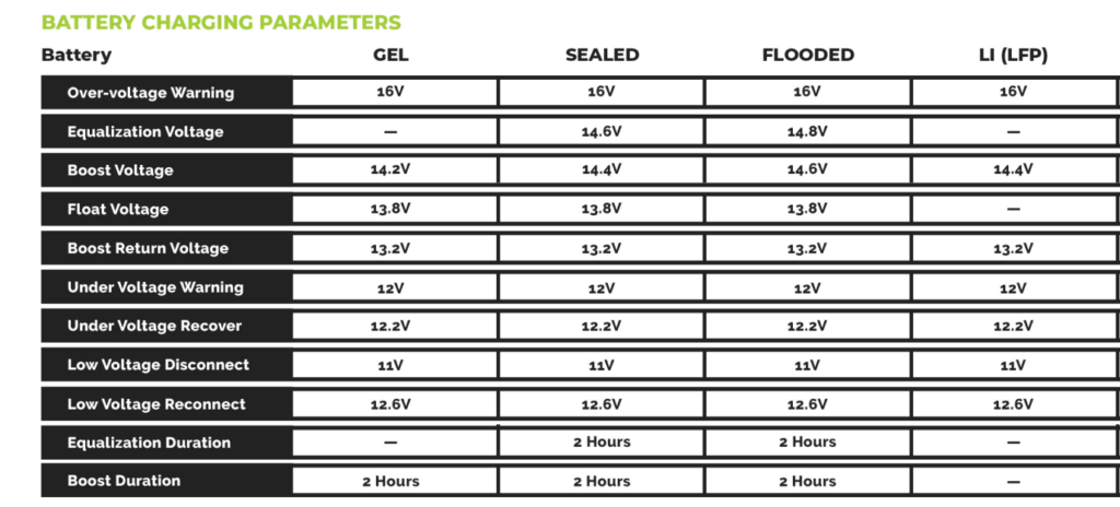The “right” voltage depends on the type of battery, so configuring the charge controller to match the battery bank is important.