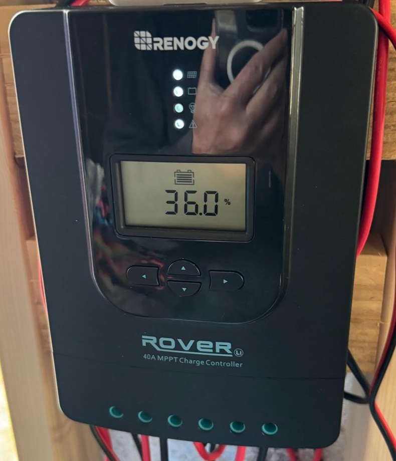 The main sizing guide on charge controllers lists the amps the controller can handle. In our case we chose the Renogy Rover RVR40 as our second charge controller. The charge controller is a “40 amp” controller, which tells us the rating for the battery current. That means it will convert the varying volts and amps from the solar panels into the right charging voltage for the battery bank, pushing out at MOST 40 amps to the batteries.